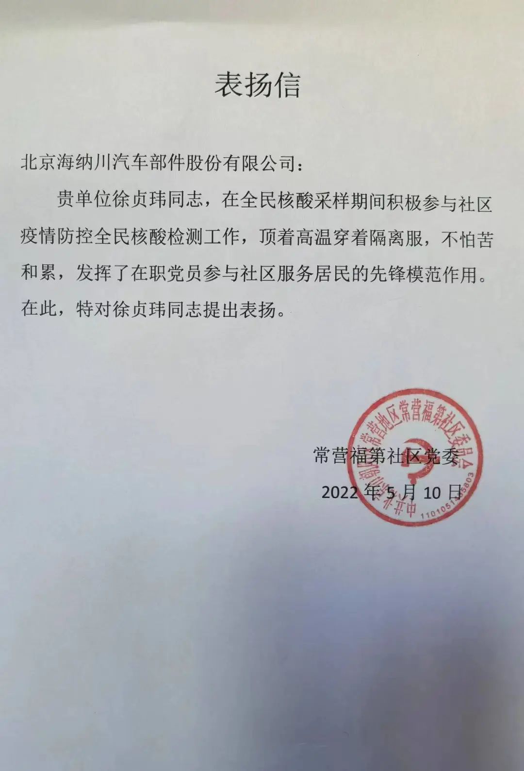 “頂著高溫穿著隔離服,不怕苦和累,發(fā)揮了在職黨員參與社區(qū)服務(wù)居民的先鋒模范作用……”日前,海納川下沉干部徐貞瑋收到一封落款為常營(yíng)福地社區(qū)黨委的表?yè)P(yáng)信,充分肯定了他的表現(xiàn)。