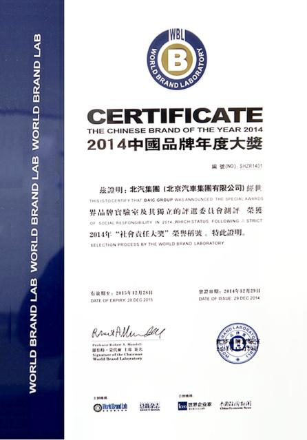 12月29日, 2014“中國品牌年度大獎”頒獎典禮在京舉行,北京汽車集團(tuán)有限公司(簡稱北汽集團(tuán))榮獲中國品牌年度大獎。這也是北汽集團(tuán)2014年自躋身《中國500最具價(jià)值品牌》后再度榮獲品牌大獎。